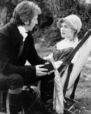 Likewise, Thompson allows Alan Rickman’s portrayal of Colonel Brandon to express true emotion. The viewer’s introduction to Brandon displays a man mesmerized by Marianne’s performance on the pianoforte. He loves the music and her voice; therefore, we know instantly that he feels passionately about her. In contrast, the novel refers to Brandon as “an absolute old bachelor.” He has spent the evening with the Dashwoods at the Middletons. In fact, the novel says that Brandon “heard her without being in raptures.” Austen’s words are quite different from the scene we know. Add the music scene from the film’s end where Brandon sends Marianne a pianoforte of her own, and we have physical signs of love. Ironically, in the novel, it is Willoughby who shares Marianne’s love of music.