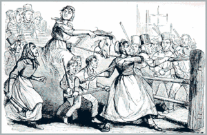 The Ceffyl Pren bears many similarities to the Rebeccas, with men wearing female clothing, blackening their faces and conducting mock trials; and was on a significant increase in the late 1830s in Wales. The Ceffyl Pren was a way of frightening and punishing members of a community, to whom wrongdoing was suspected, but little will or evidence existed to bring the person to justice. Normally ‘crimes’ punished by the Ceffyl Pren included marital infidelity or informing on a neighbour.