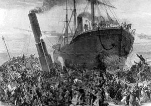 Estimates said that the two parts of the steamer sank within four minutes. Those who had booked cabins between the decks had no opportunity for escape. “Nearly everything went wrong, costing the lives of almost everyone aboard, passengers and crew alike. There were only two lifeboats on davits carried, no rafts or lifebelts and just a few life rings, insufficient even if there had been time to launch them correctly. The tide began bearing some would be survivors away from the collier and possible rescue, while Captain Harrison, seeing all the people in the river around his vessel had stopped his engines and had drawn the fires. He could push ahead for fear of injuring those nearby and was unable to turn the propeller through lack of steam and anyway, his engineers and stokers were in his lifeboats trying to rescue the drowning. The collier’s crew did all they could to save as many people as possible: they launched their own lifeboats; other hands on the forecastle threw lifebuoys, ladders, and lines to those struggling in the river below. Swimming had never been a popular pastime in Victorian London, and the long many petticoated dresses of women were an impossible impediment. Many apparently, just clung to their children and sank from sight.” (The River Thames Police Museum)