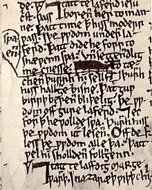 Public Domain ~ A page from the Ormulum demonstrating the editing performed over time by Orm (Parkas 1983, pp. 115–16), as well as the insertions of new readings by “Hand B”. en.wikipedia.org/wiki/Ormulum