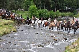 Calendar Customs adds, “The Common Riding at Langholm takes place on the last Friday in July. Common Ridings are a boundary marking custom on horseback. They are mainly held at locations across the Scottish Borders, perhaps because this area suffered from centuries of raiding and reiving between local families and the English, and the locals needed to protect their lands from encroachment. Long after this was necessary, the Ridings survived to become major festivals and a great day out! As with all the common riding customs, expect lots of equestrians and flag waving and , uniquely to Langholm, the four emblems of the festival which are carried in the procession. They are a barley bannock & a salted herring on a pole, a spade, a giant thistle and a crown. Watch out for the spectacular gallop up Kirk Wynd and the Fair Crying, when the proclamation is read by a man standing on the back of a horse! The equestrians ford the river to get to Castleholm, where racing follows; dancing and other sporting events take place around town throughout the day.”