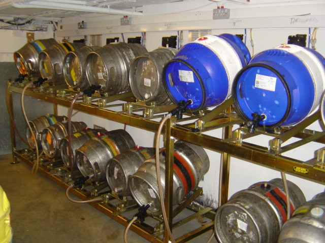 A stillage need not be complicated – anything that will support a cask (preferably on three points to avoid any wobbling) will do. At temporary events, sturdy tables or frames made of scaffolding and planks might be used, with the casks placed on wooden wedges (two at the front, one at the back). At the other end of the scale, many pub cellars use specially-made steel racking, often with two rows of casks one above the other. Some pubs have brick or stone stillages, sometimes quite ancient, built into the wall of the cellar.