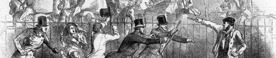 Thursday, 19 May 1849, William Hamilton, a 22-years-old, orphaned, unemployed Irish bricklayer, fired a pistol at the Queen Victoria, as she drove, yet again, down Constitution hill toward Buckingham Palace. This was shortly after the birth of her seventh child. Hamilton had stationed himself in Green Park. On the evening of the official commemoration of her birthday, Queen Victoria rode through Hyde and Regent’s Park with three of her children, including the future King Edward VII.