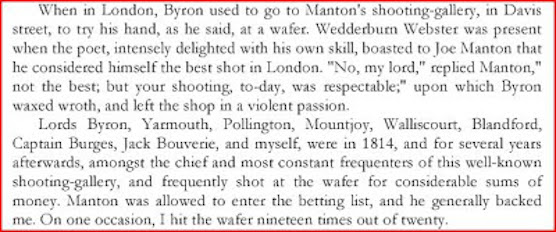 “MANTON, JOSEPH (1766?–1836), gunmaker, was, according to the specification of a patent granted to him in April 1792, then established in business in Davies Street, Berkeley Square, London; his name does not appear in the ‘Directory’ until two years afterwards. He remained in Davies Street until 1825, and his shop, No. 25, became widely known to shooters.”