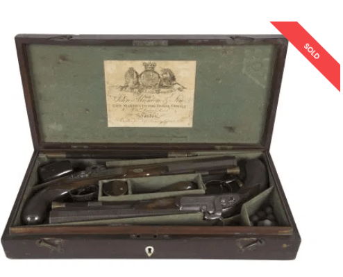 Daniel’s Antiques describes a pair of dueling pistols recently sold on the site as this: “One of the greatest technologies Manton refined was the accuracy of the dueling pistol. The inaccuracy of the dueling pistols as they were led to less wounds and deaths, and were designed for a quick draw. Manton wanted to improve the slow shot of the dueling pistol because of the increasingly popular event of target practice. Those who purchased these heavier barreled dueling pistols from Manton were at a clear advantage if they were to be caught defending their honor. Many gentleman would visit the shooting gallery of Manton to practice their slow shots, and refine their precision so that they could always be ready for a duel.