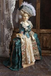 Many fashionable women actually owned a pair of these dolls, one dressed grandly, which was known as the Grande Pandore, and one in en dèshabille, known as Petit Pandore. French fashions dolls could be found throughout Europe. Meanwhile, English fashion dolls were shipped to America. Paper dolls were also used to preview one’s choice of wardrobe or coiffure.