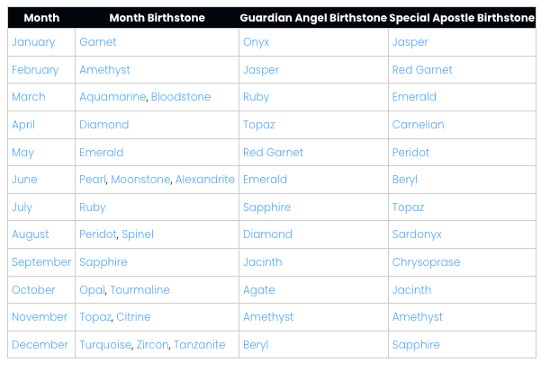 “The 12 foundation stones mentioned in the Revelation of St. John are directly associated with the 12 apostles. The assignment of each gem to the respective apostle happened at a later time, around the 8th century. Besides this, even later, we would see the 12 angels associated with the months and signs of zodiac. Guardian angels birthstones are also commonly called ‘talismanic gems’.
