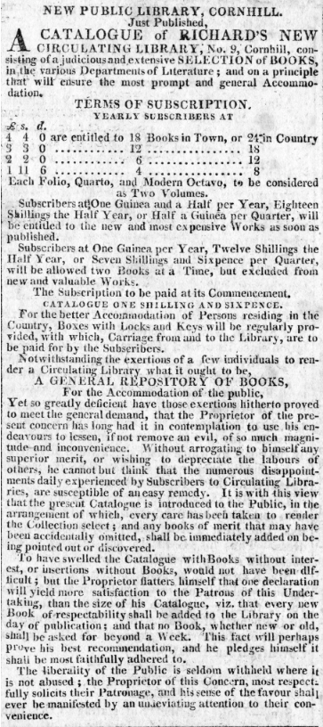 “By the mid-eighteenth century, the social aspects of these literary bookstores were nearly as important as the books they housed. In 1742, the Reverend Samuel Fancourt, a dissenting minister, opened what many believe to be the first circulating library in London. In fact, Fancourt may very well have coined the term, for the first instance of “circulating library” in print cited in the Oxford English Dictionary is from one of Fancourt’s advertisements in June of 1742. This library was organized on a subscription plan, by which those who wished to use the books became a member of the library. Each member paid one guinea per year, plus a shilling each quarter day. Fancourt had to relinquish ownership of his library in 1745, but the books were kept and other members reorganized the library as a non-commercial entity run by a committee of the subscribers. They maintained the same dues and fees, out of which they were able to rent rooms for the library in Crane Court, Fleet Street and pay the salary of the librarian, the Rev. Fancourt. The contents of this library were primarily theological, philosophical and technical, thus only appealing to a limited readership. But others in London saw the promise of this circulating library model and soon there were circulating libraries opening up all around London. Within a decade, they began to spread to other cities and towns across Britain. There were soon thriving circulating libraries in Bath, Bristol, Liverpool, Newcastle, Norwich, Birmingham, Hull and Edinburgh. Eventually, nearly every village and hamlet across Britain could boast a circulating library, be it ever so small.