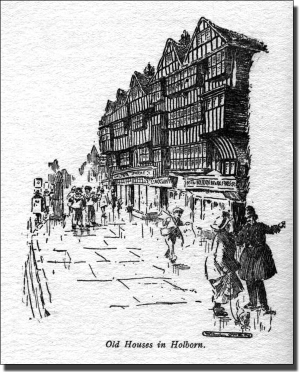 Building Wooden Houses tells us, “These fine old buildings still exist in Holborn, at the end of Gray’s Inn Road. The lower floors are shops and up above, the different floors each jetty out beyond the one below. Rain drips away safely from each floor and the building stays dry.