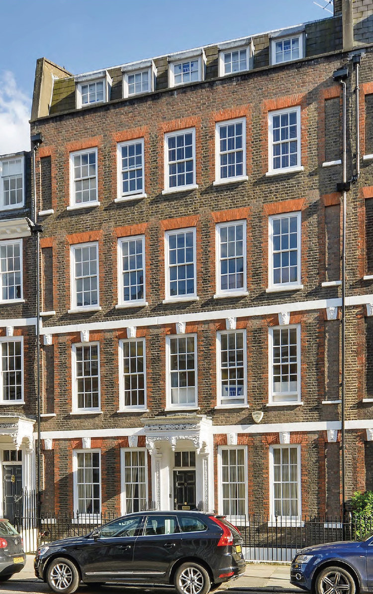 The windows of the house in Bedford Square have wooden frames of the earlier style, flush with the façade.