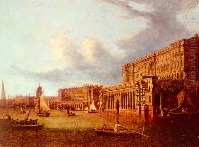 To complete the Adelphi, the Adam brothers took out a 99-years’ lease from the Duke of St Albans in 1768 of the site of Durham House. After clearing the site, in 1771, they petitioned for an Act of Parliament so they might reclaim a shallow “bay” formed by the river at this point and erect a wharf and other necessary buildings.