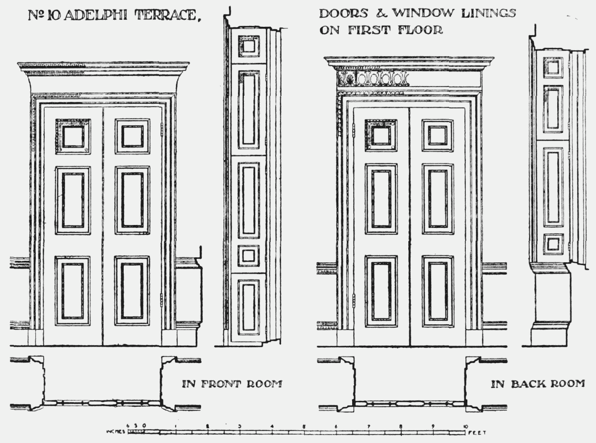 The houses as originally designed showed plain brick facades with portions emphasised, such as the angles or centres of the blocks, with ornamented pilasters, entablatures, string courses, etc., in stucco, pleasantly designed metal balconies to windows, metal railings to areas, with lamp standards flanking doorways, and enriched door-cases. The character of the treatment will be seen by reference to the illustrations, which also show parts of the interior with the characteristic Adam decoration in wall linings, ceilings, fireplaces, door-cases, staircases, vestibule and other screens, etc. The ceilings in some cases include paintings by artists of the period, as e.g. that to the first-floor front room of No. 4, Adelphi Terrace.