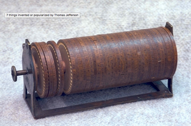 007 might have admired this next invention. “The wheel cipher was a helpful tool devised by Jefferson for encoding messages with ease. It was a small circular device with 36 wooden disks on a spindle. Each disk had letters of the alphabet in different orders. When arranged in different patterns, you could create a ‘key’ and inscribe messages under a set cipher.” Jefferson basically abandoned the idea sometime around 1802, but it was revived around 1922 and used by the U.S. military to the beginning of WWII.