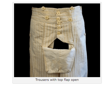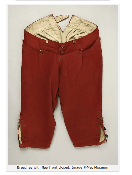 breeches – gentlemen’s pants or slang for a woman who governs over her husband; “By the turn of the 19th century, breeches, pantaloons and trousers worn by all men were sewn with a flap in front called a fall front. This flap was universally held in place by two or three buttons at the top. No belts were worn. Instead, breeches, pantaloons and trousers were held up by tight-fitting waists, which were adjusted by gusset ties in back of the waist. Seats were baggy to allow a man to rise comfortably from a sitting position. As waists rose to the belly button after 1810, suspenders were used to hold the garment up.”