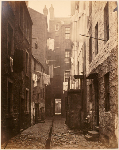 “The tenements were three or four storey stone buildings entered by a ‘close’ which gave access to the common stair and the back court. Off the stair were the apartments, and beneath them the cellars, in which the working class lived. Very few of these tenements had internal sanitation or water supplies; a privy in the back court and a hand pump for water in the street would often supply hundreds of occupants.” [The Old Closes and Streets of Glasgow]