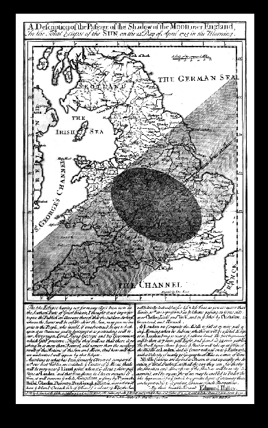 It was known as Halley’s Eclipse, after Edmond Halley (1656–1742) who was the second man to be appointed Astronomer Royal, predicted this eclipse to within 4 minutes accuracy. Halley observed the eclipse from London where the city of London enjoyed 3 minutes 33 seconds of totality. He also drew a predictive map showing the path of totality across the Kingdom of Great Britain. The original map was about 20 miles off the observed eclipse path, mainly due to his use of inaccurate lunar ephemeris. In astronomy and celestial navigation, an ephemeris is a book with tables that gives the trajectory of naturally occurring astronomical objects as well as artificial satellites in the sky, i.e., the position (and possibly velocity) over time. Historically, positions were given as printed tables of values, given at regular intervals of date and time. [“ephemeris”. American Heritage Dictionary of the English Language (3rd ed.). Boston: Houghton Mifflin. 1992.]