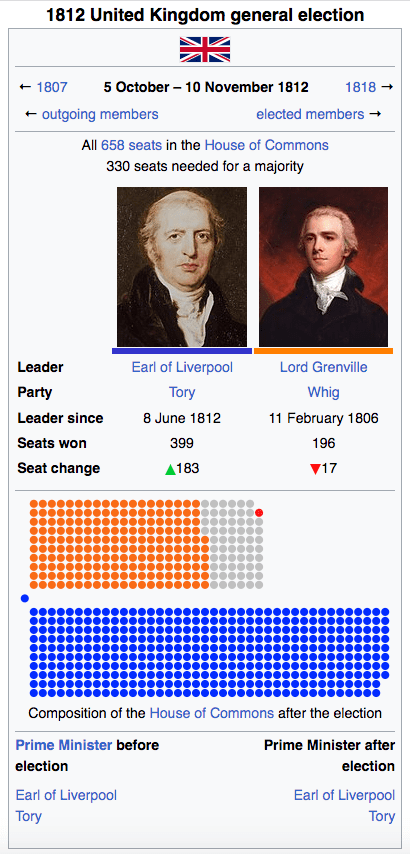 First Part of my response: You must remember that unlike here in the U.S. there were not elections every four years. “The 1812 United Kingdom general election was the fourth general election after the Union of Great Britain and Ireland, held on 5 October 1812 to 10 November 1812, taking place at the height of the Napoleonic Wars.