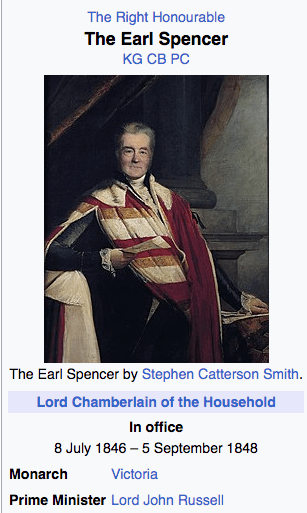 “Vice-Admiral Frederick Spencer, 4th Earl Spencer, (14 April 1798 – 27 December 1857), styled The Honourable Frederick Spencer until 1845, was a British naval commander, courtier, and Whig politician. He initially served in the Royal Navy and fought in the Napoleonic Wars and the Greek War of Independence, eventually rising to the rank of Vice-Admiral. He succeeded his elder brother as Earl Spencer in 1845 and held political office as Lord Chamberlain of the Household between 1846 and 1848 and as Lord Steward of the Household between 1854 and 1857. In 1849 he was made a Knight of the Garter.”