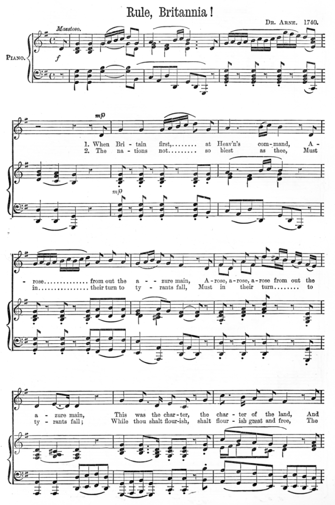 As a side note, Thomas Arne is well known in Great Britain for another accomplishment. He set to music James Thomson’s poem “Rule, Britannia”. The song was originally the final number in Arne’s masque, Alfred, about Alfred the Great. It was written to commemorate the accession of Frederick’s grandfather George I and the birthday of Princess Augusta. “Rule, Britannia” was the most lasting expression of the conception of Britain and the British Empire that emerged in the 1730s.