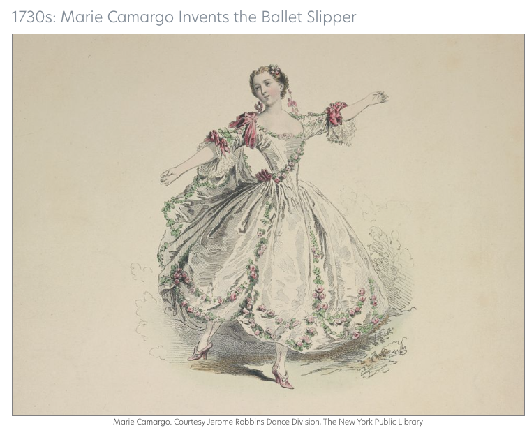 The History of Pointe Shoes provides us this background information that goes with the image of Marie Camargo above. “During ballet’s creation in the courts of Europe, dancers wore heeled shoes in line with the era’s aesthetic. In the 1730s, Paris Opéra Ballet dancer Marie Camargo was the first to remove her shoes’ heels, forging the way for the soft slipper we know today. “Camargo is the transitional point between a heeled shoe and pointe shoe. She is the ballet slipper,” says Linda Murray, curator of the Jerome Robbins Dance Division of the New York Public Library for the Performing Arts. The slipper allowed Camargo to perform leaps and fast allégros that were not possible in heeled shoes, expanding movement vocabulary for ballerinas.”