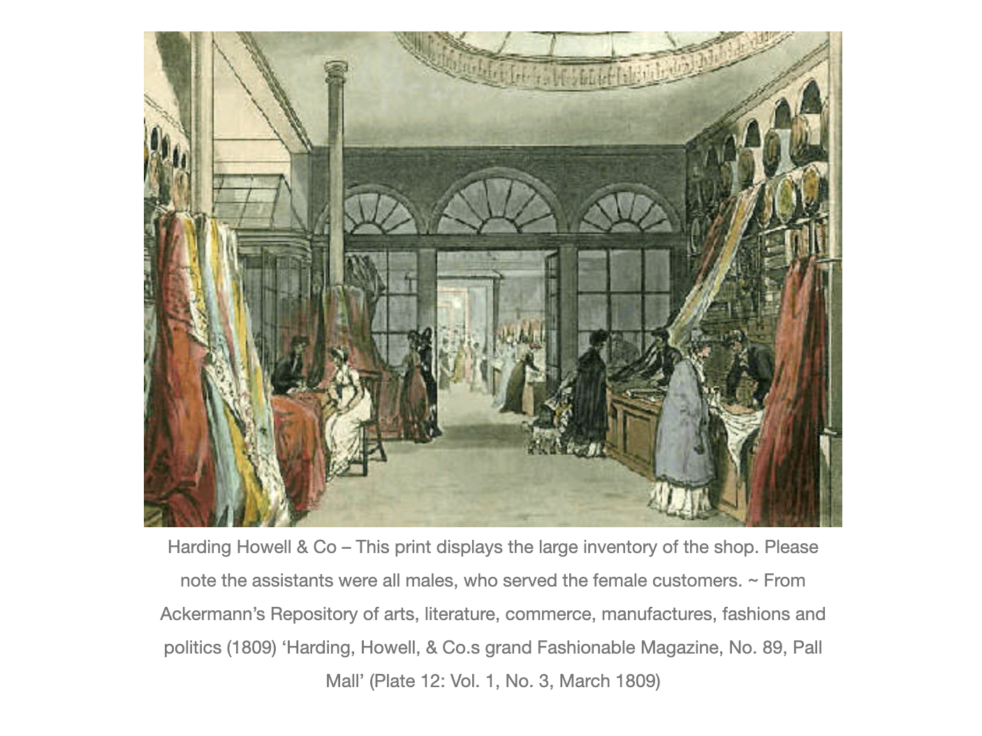 By the beginning of the 19th Century, it is estimated that 200 different shops could be found in London. These shops kept long hours, generally, 12-hour days. The shopkeepers and their assistants often lived on the premises. Warehouses were located in Covent Garden. Mercers and linen drapers could be found in Cheapside. Shops lined the streets with shopkeepers living above. We know that ladies of Society shopped on Oxford Street an Bond Street in Mayfair. Men frequented the shops and gentlemen’s clubs in St. James. Newer styled shops sprung up along the Strand.