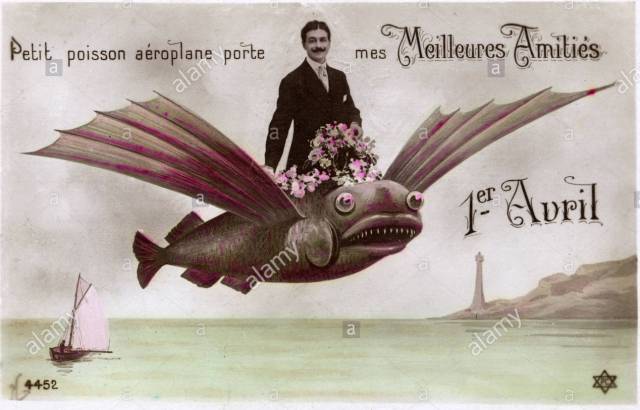 Hoaxes.org tells us, “The French term for ‘April Fool’ is ‘poisson d’Avril.’ It translates literally as ‘April Fish.’ The term appears in several late-medieval French poems — first in the work of Pierre Michault (1466) and next in La Livre de la Deablerie (1508), by Eloy d’Amerval. This has led some to suggest, quite reasonably, that these may be early April Fool’s Day references. However, etymologists believe that the phrase ‘poisson d’Avril’ originally referred to a matchmaker, or to someone who delivered messages between two lovers. It was only in the late 17th century that the phrase acquired its modern association with April Fool’s Day. And if we examine these late-medieval poems, we see that this is the case. For example, Michault’s poem describes the advice being given to a page, who is being told how to deliver messages between a lord and lady to further their illicit affair, and how to do this to his own advantage. Michault writes: