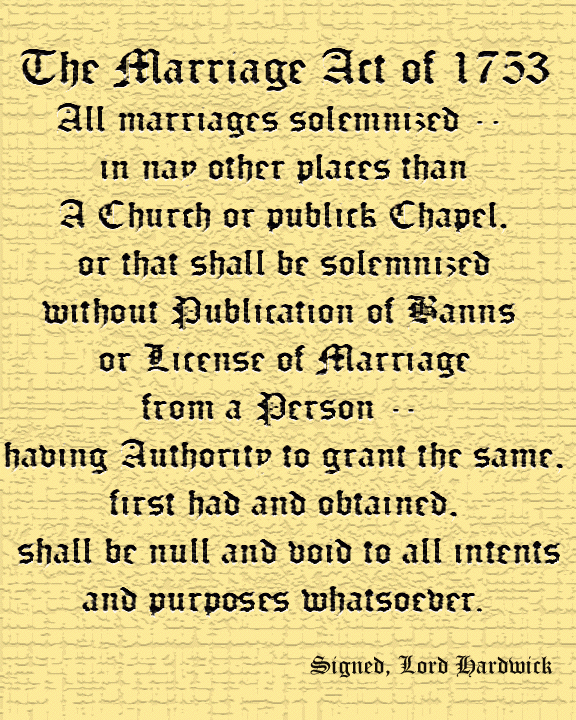 The poor often married without benefit of clergy or ceremony–they just called themselves married and that was that (made divorce a lot easier and possible, too). Needless to say, the Church of England heartily disapproved. The old custom–marriage by cohabitation had been legal before the Hardwick Act of 1753, and there was the even older custom of handfasting–often held with the very poor, particularly since marriage was more about a legal agreement as to the disposition of property and inheritance from a legal alliance.