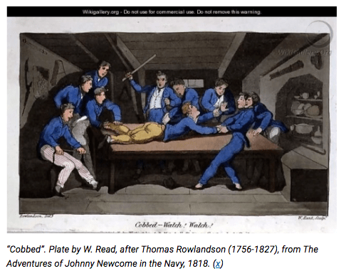 cobbing – “A punishment often used aboard ship to address petty offenses. It normally involved 12 or so whacks to the posterior with a cobbing stick (a heavy, flat piece of wood resembling a yardstick) or pipe staff, although handsawa or anything flat could also be used in a pinch. The first stroke on the back was traditionally accompanied with the cry of “Watch” at which time all crew in the vicinity removed their hats on pain of like punishment. The closing stroke, which was always delivered with as much force as possible, was called the “purse”. But that only referred to the way in which the adults or boys over 14 were punished. Boys under 14 and midshipmen were punished with a slap on the butt, but the procedure was the same.” [https://ltwilliammowett.tumblr.com/post/695849527296606208/cobbing]