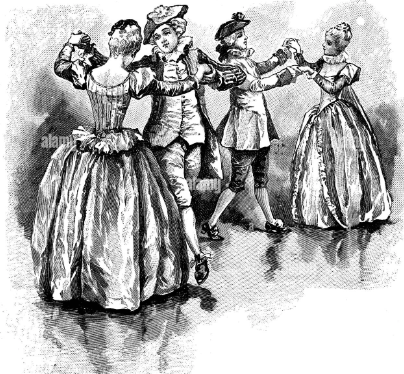 contredance; early 18th Century wood engraving after drawing by Fritz Bergen – Public Domain
