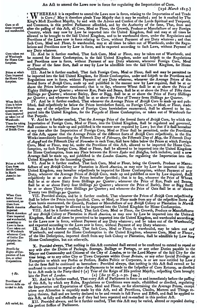 1815 Corn Law, An Act to amend the Laws now in force for regulating the Importation of Corn ~ Public Domain